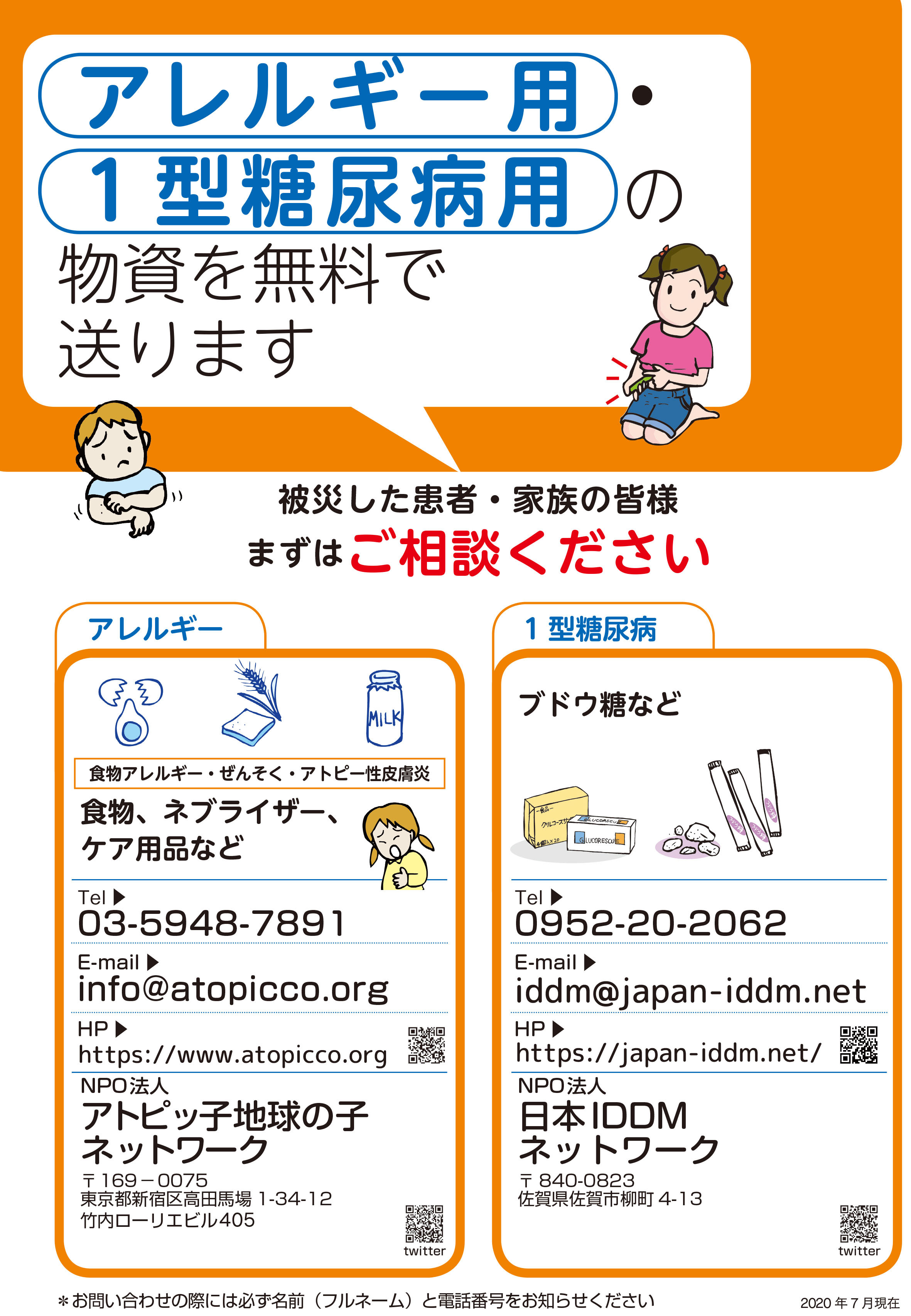 【災害弱者支援活動をしています】 2020年7月7日 最終更新日時 : 2024年2月26日 atopicco FacebookXBlueskyHatena【災害弱者支援活動をしています】 食物アレルギーがある方への非加熱食品やアトピー性皮膚炎がある人のスキンケア用品など、必要な物を個人の居場所に届けています。 詳細の聞き取りをさせていただきます。まずはお問い合わせください。 メールでお問い合わせくださるときは、名前、電話番号、アレルゲン、症状がある人の年齢を必ずお知らせください。 NPO法人アトピッ子地球の子ネットワーク FacebookXBlueskyHatena
